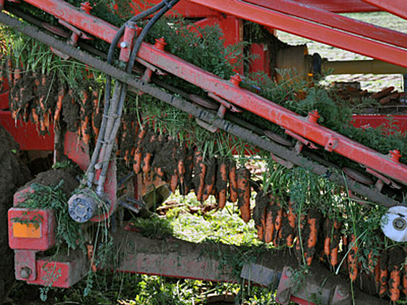Besonders stolz sind wir auf unsere Namensgeberinnen, die Gelben Rüben. Früher waren es die Futterrüben fürs Fränkische Gelbvieh, heute sind es die Möhren, die auf unseren fruchtbaren Lehmböden in ganz besonderer Qualität wachsen. Wir haben für unseren Standort ein speziell angepasstes Anbauverfahren entwickelt: Auf Dämmen gedeihen sie besonders gut und wachsen formschön heran. Die Dämme erwärmen sich im Frühjahr schneller und fördern so das Wachstum der Rüben. Die Karotten benötigen viel Pflege. Vor allem die Unkrautregulierung, die wir mit Hackmaschine und Handhacke durchführen, ist sehr aufwändig. Etwa 300 Arbeitsstunden pro Hektar benötigen wir von der Aussaat bis zur Ernte.